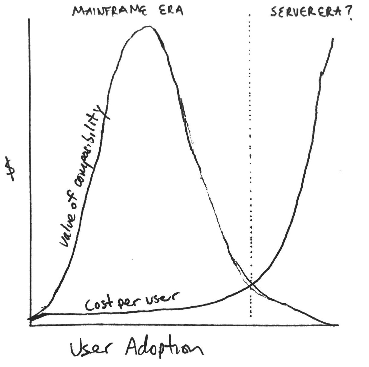 This is the “mainframe era” of blockchains. While there are no doubt early network effects due to composability—pooled security, userbase, data, and running code—this comes with diminishing marginal returns as adoption pushes against the throughput limitations of the mainframe. This, in turn, drives up cost for each additional user and developer. Plotted on a chart, it looks something like this: