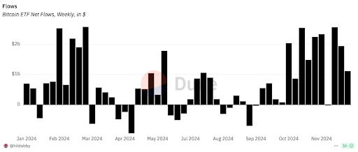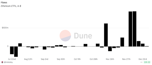 One way to measure ETP activity is through “net flows”, which represent the amount of BTC or ETH moving into or out of the ETPs. (Excluding pre-existing products like the Grayscale Bitcoin and Ethereum Trusts, which were eventually converted to ETPs.) So far, there have been 515,000 BTC net flows (resulting in $110B in onchain holdings) and 611,000 ETH net flows (resulting in $13B in onchain holdings).