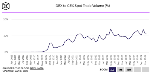 As more people come onchain, we expect to see decentralized exchange (DEX) usage increase relative to their centralized-exchange counterparts (CEXs) when it comes to trading crypto. After all, a core premise of crypto is decentralized finance or DeFi. The share of spot trading on DEXs has grown steadily to ~11% over the last few years as the DeFi ecosystem has developed, and we expect that trend to continue in 2025.