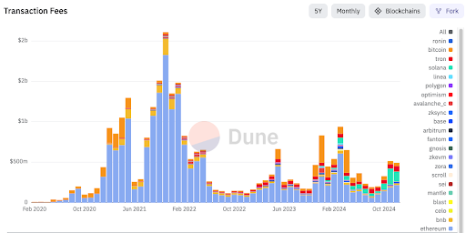 The total amount of USD-denominated transaction fees shows the aggregate demand — that is, the real economic value — for blockspace on a given chain.