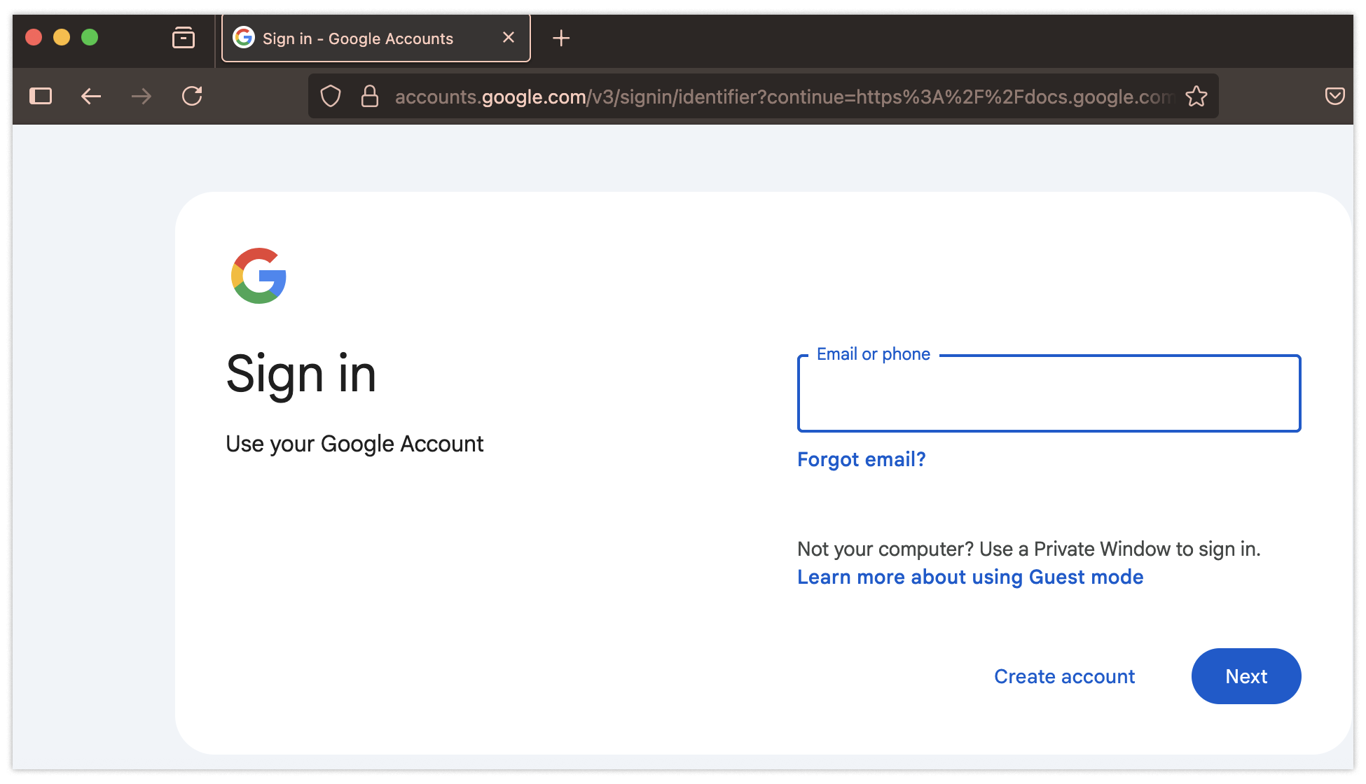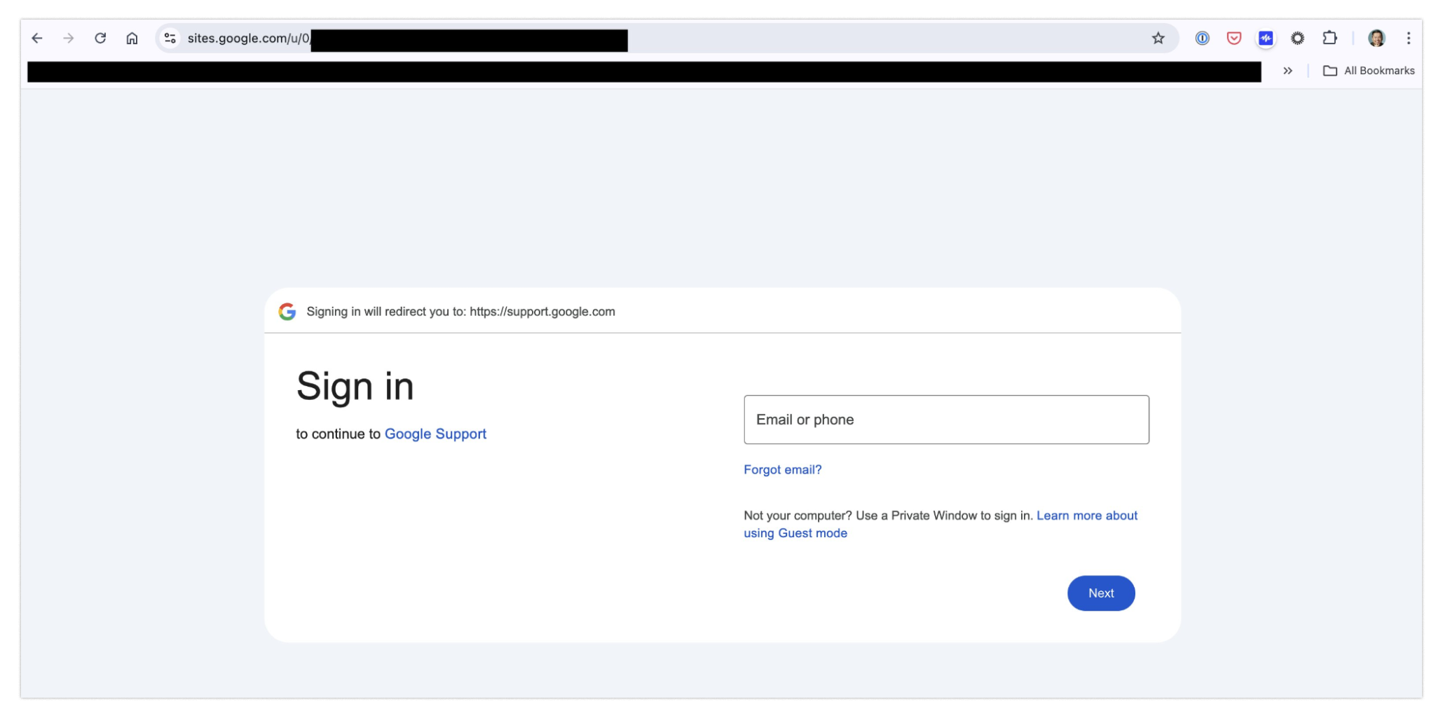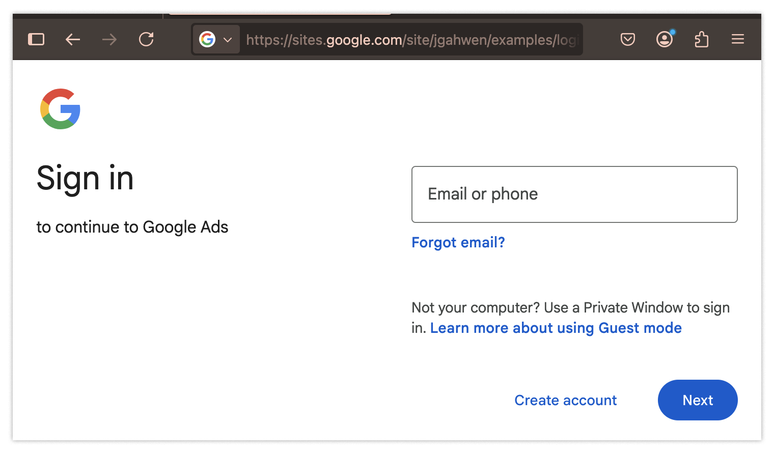Same goes for the last red flag: the login form.If you look carefully at the URL when logging in, you will notice sites.google.com in place of the usual URL, accounts.google.com, that you would expect to see anytime you log into a Google account.