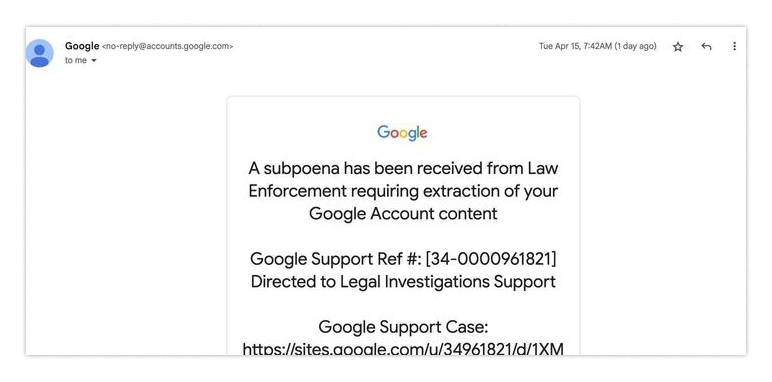 The note is telling you you’re under investigation. That’s scary! Maybe you should throw aside all doubts and go see what is wrong? Having personally gotten a real Google alert with a similarly scary premise, I assure you, the urge to go directly where they tell you and try to resolve it can be all-consuming, especially if your online identity is based on Google’s email service.
