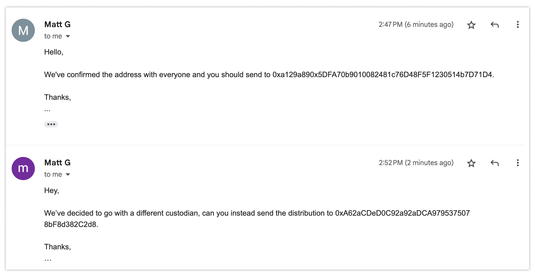 Everyone else on the thread is fake. You’re the only real one. So you just sent a sizable amount of money to some random people without noticing that their email addresses had changed.