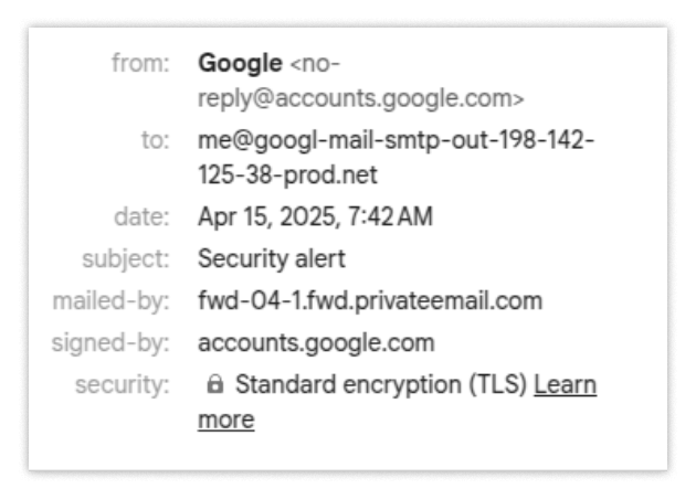That’s probably the easiest place to smell something phishy, but let’s poke through it a few more times. When looking at the email, you may expect to see “you” — that is, your email address — in the “to” field. Something we don’t expect to see is that “you” is actually the email: me@google-mail-smtp-out-198-142-125-38-prod.net.