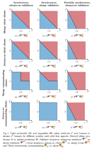 The answer to what percentage is right depends on how clients are modeled. Are the clients sleepy or always-on? Are they silent or communicating? Can validators be sleepy too? And is the network synchronous or partially synchronous? In a new paper, we (with Dionysis Zindros of Common Prefix, and David Tse of Stanford University and BabylonChain) systematize models for consensus across these four dimensions. Being systematic about the nature of clients allows us to tightly characterize the achievable safety and liveness resiliences with matching possibilities and impossibilities for each of the sixteen models. We’re able to unify folklore and earlier results, and fill gaps left in the literature with new protocols and impossibility theorems.