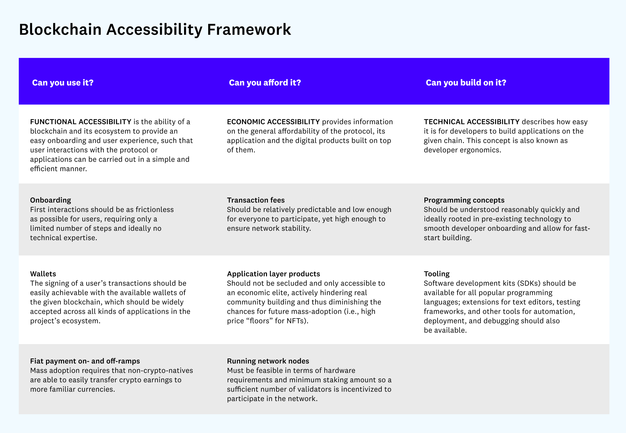 Accessibility describes the general ability of a blockchain network to be used by a wide array of different entities in a frictionless way. The easier it is for a user to take part in a project’s applications, protocol, or ecosystem, the higher the accessibility of the given blockchain. Accessibility applies not only to end-users, but also to developers, creators, product owners, and any other parties interacting with the network. Who should be thinking about accessibility? Developers, architects, and executives who actively build and manage blockchain-enabled applications should conduct an accessibility analysis when choosing a blockchain to build on. And anyone who leverages the existing services of a blockchain’s ecosystem — creators, artists, and IP holders — should consider the accessibility of a given project, since it will determine the size and characteristics of the existing audience on the network.Rather than solely playing the numbers game, both of these groups need to ask the right questions: What does the ecosystem’s culture look like? What types of people are building here? What are the digital goods offered by the projects building on it, and how do the economies around it evolve? And most importantly: Is this all accessible for the masses? These questions should be asked from a 1) functional, 2) economic, and 3) technical perspective, which leads to the framework we propose here including questions for any crypto builders who desire mainstream adoption. (Click to expand chart, and read on.)