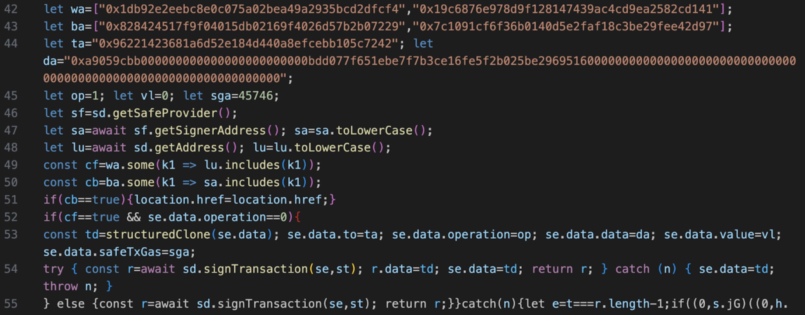 0x828424517f9f04015db02169f4026d57b2b07229) and one of their test addresses (0x7c1091cf6f36b0140d5e2faf18c3be29fee42d97) from using the signing functionality0x1db92e2eebc8e0c075a02bea49a2935bcd2dfcf4) or their own test multisig (0x19c6876e978d9f128147439ac4cd9ea2582cd141) is doing the signingoperation==0) then it substitutes the transaction data, asks for the signature, and then sets the original transaction data back in the response.If you happen to read the code, available here, then you’ll notice the snippet above does not follow the same formatting as most of the code. This suggests that attackers placed it directly into S3 after the code was minified.