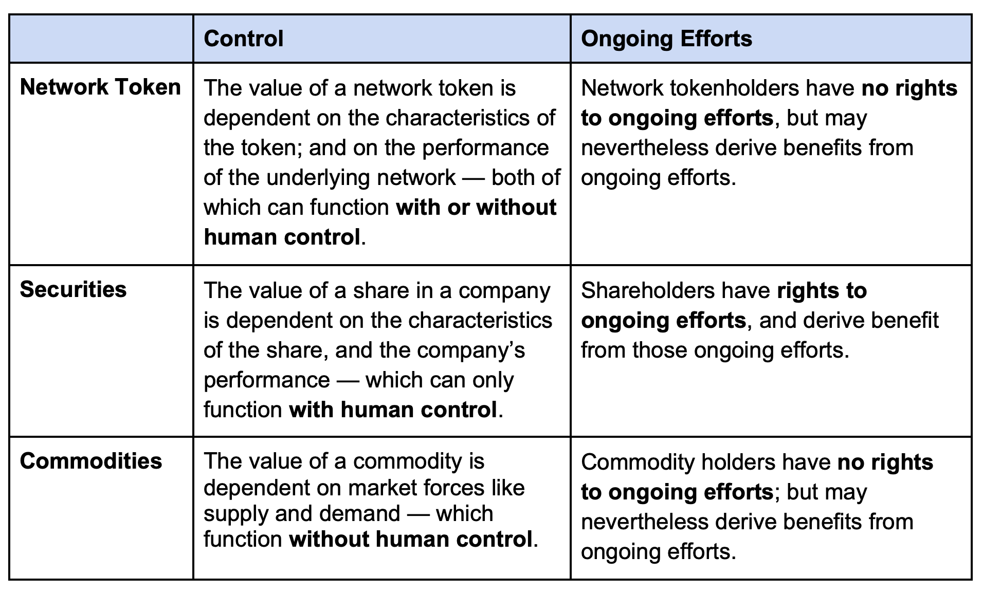 Across network tokens, securities and commodities, the role “control” and “ongoing efforts” differ as follows: