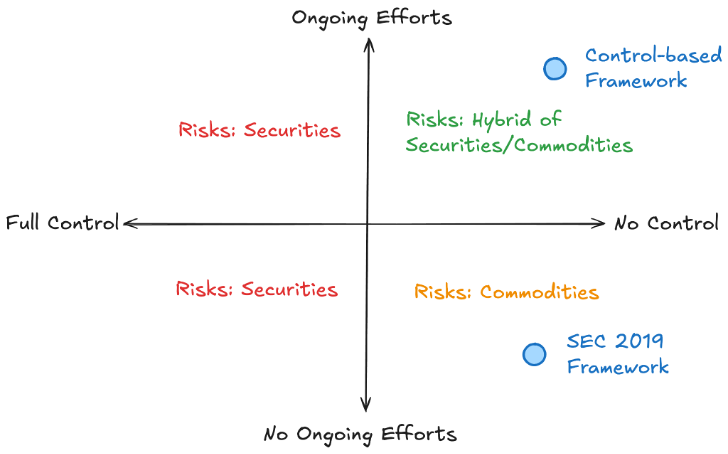 While simple, the use of a two-pronged approach is a significant improvement. The 2019 framework sought to subject projects to securities laws if they operated anywhere other than the lower right quadrant below (no control/no ongoing effort) — which is what led to abuse by regulators and perverse incentives for developers. But this new two-pronged approach would more appropriately provide projects with a pathway to operate in the upper right quadrant (no control/with ongoing effort) — where those network tokens have a risk profile that reflects a hybrid of commodities and securities.