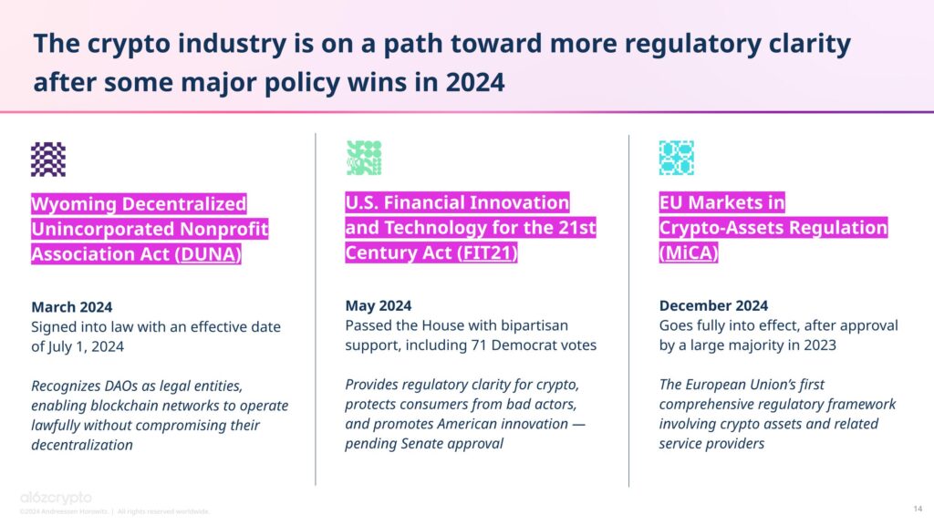 No less meaningfully, at the state level, Wyoming passed the Decentralized Unincorporated Nonprofit Association (DUNA) Act, a law that gives decentralized autonomous organizations (DAOs) legal recognition and enables blockchain networks to operate lawfully without compromising on decentralization.