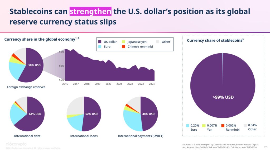 Stablecoins — which have become one of the most popular crypto products — are one of the biggest topics for policy discussion, with several bills already floating around Congress. One of the tailwinds, at least in the U.S., is the realization that stablecoins can fortify the U.S. dollar’s position abroad even as the dollar’s global reserve currency status slips. Today, more than 99% of stablecoins are denominated in USD, which dwarfs the next largest denomination: 0.20% in Euro.
