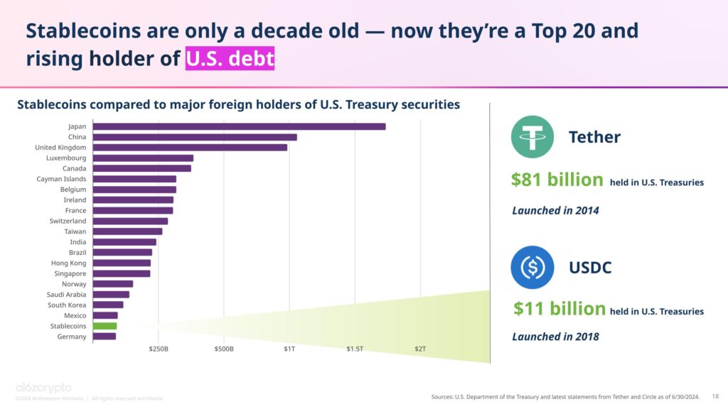 In addition to projecting the power of the American dollar around the world, stablecoins are potentially strengthening the country’s financial footing at home. Despite being only a decade old, stablecoins have risen to become a top 20 holder of U.S. debt, putting them ahead of countries like Germany.