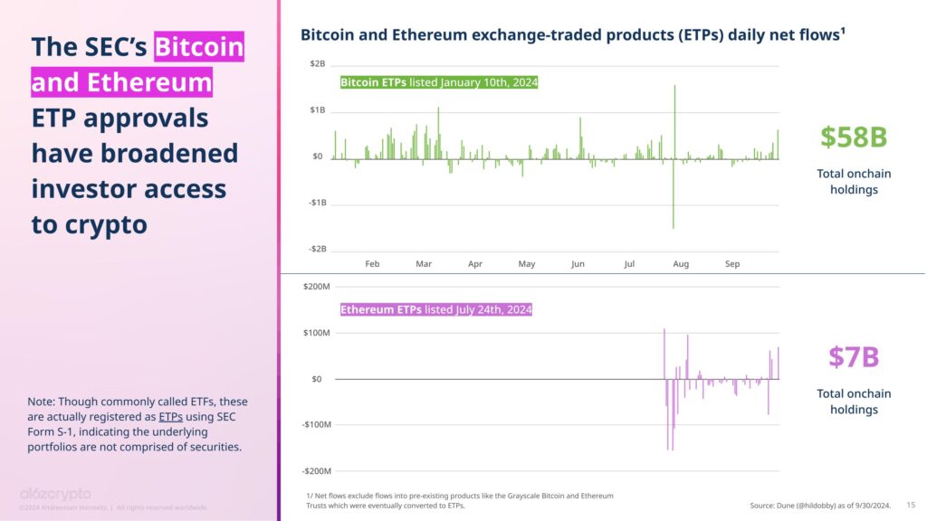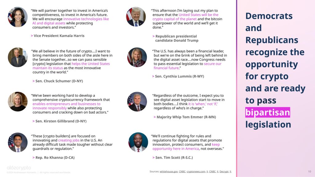The SEC’s ETP approvals represent major crypto policy milestones. Regardless of which party wins office in November, many politicians expect momentum to build with the passage of bipartisan crypto legislation. An increasing number of policymakers and politicians are speaking positively about crypto on both sides of the aisle.