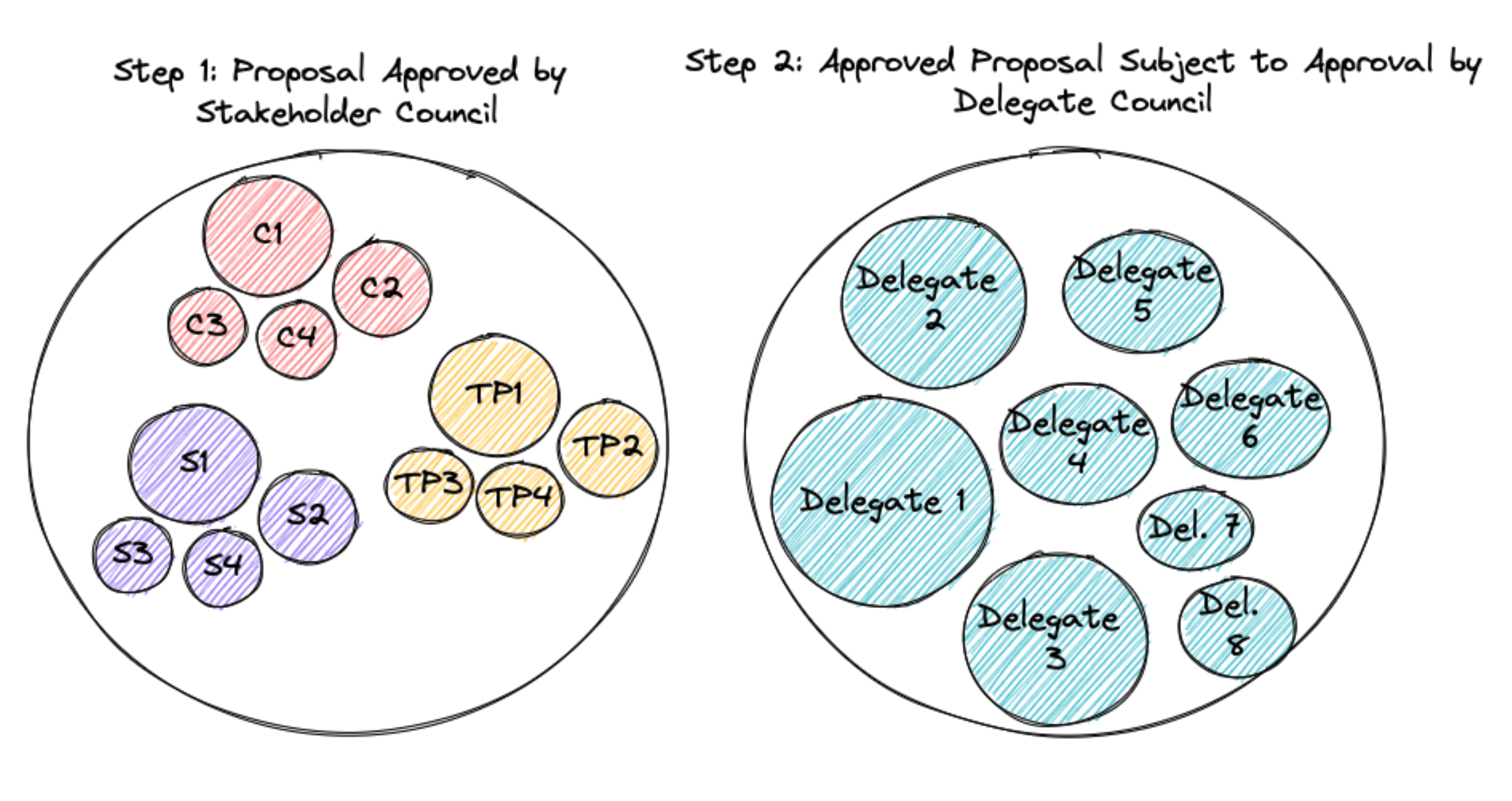 Together, the stakeholder council and the delegate council would have the power to approve proposals brought before the DAO. One or both councils could be the initial governance layer responsible for creating new proposals, with the other layer then having either negative authority (a proposal approved by one council goes through unless vetoed by such council) or positive authority (a proposal approved by one council only goes through if approved by such council).