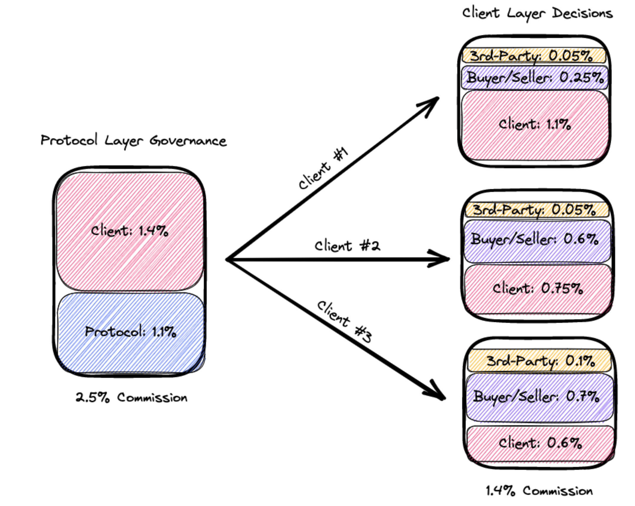Complex parameter setting. For the simplest version of Blockzaar, the only parameters capable of being changed by the DAO could be the commission rate applied to transactions and the split of that commission rate between the protocol layer and the client layer. As reflected below, the split of the commission rate among clients/ users/ third-party product and service providers could be pushed to the client layer, where each individual client could determine how to split the commission it receives from the protocol with its users and third-party product and service providers: