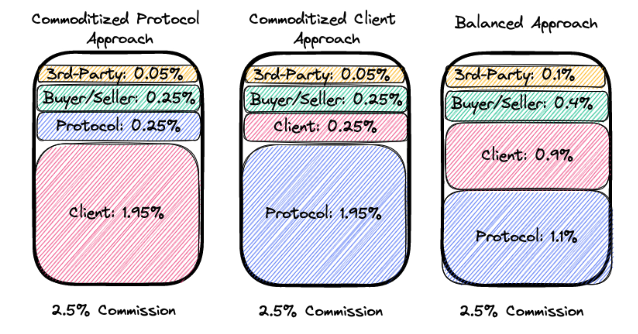 As reflected in the image above, the balanced approach yields 1.1% of the 2.5% commission to the protocol, 0.9% to the client through which a transaction is initiated, 0.4% to the buyer or seller and 0.1% to the provider of third-party services. As a result, token holders (via the value accrual to the protocol) and other stakeholders are rewarded for the execution of the transaction.