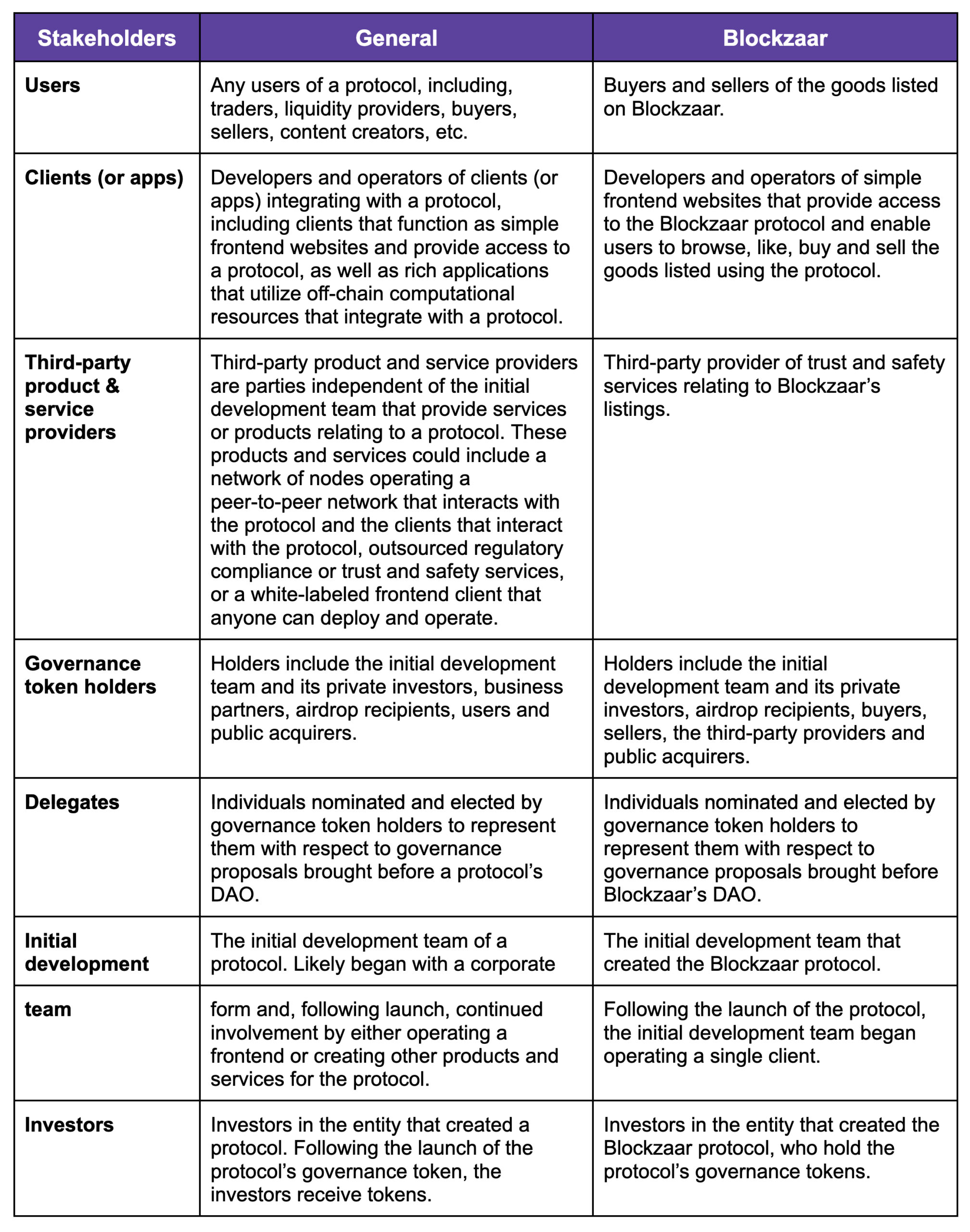 The stakeholders of a web3 protocol include a number of different participants, including users, apps (or clients), third-party product or service providers, governance token holders, delegates, the initial development team, and investors: