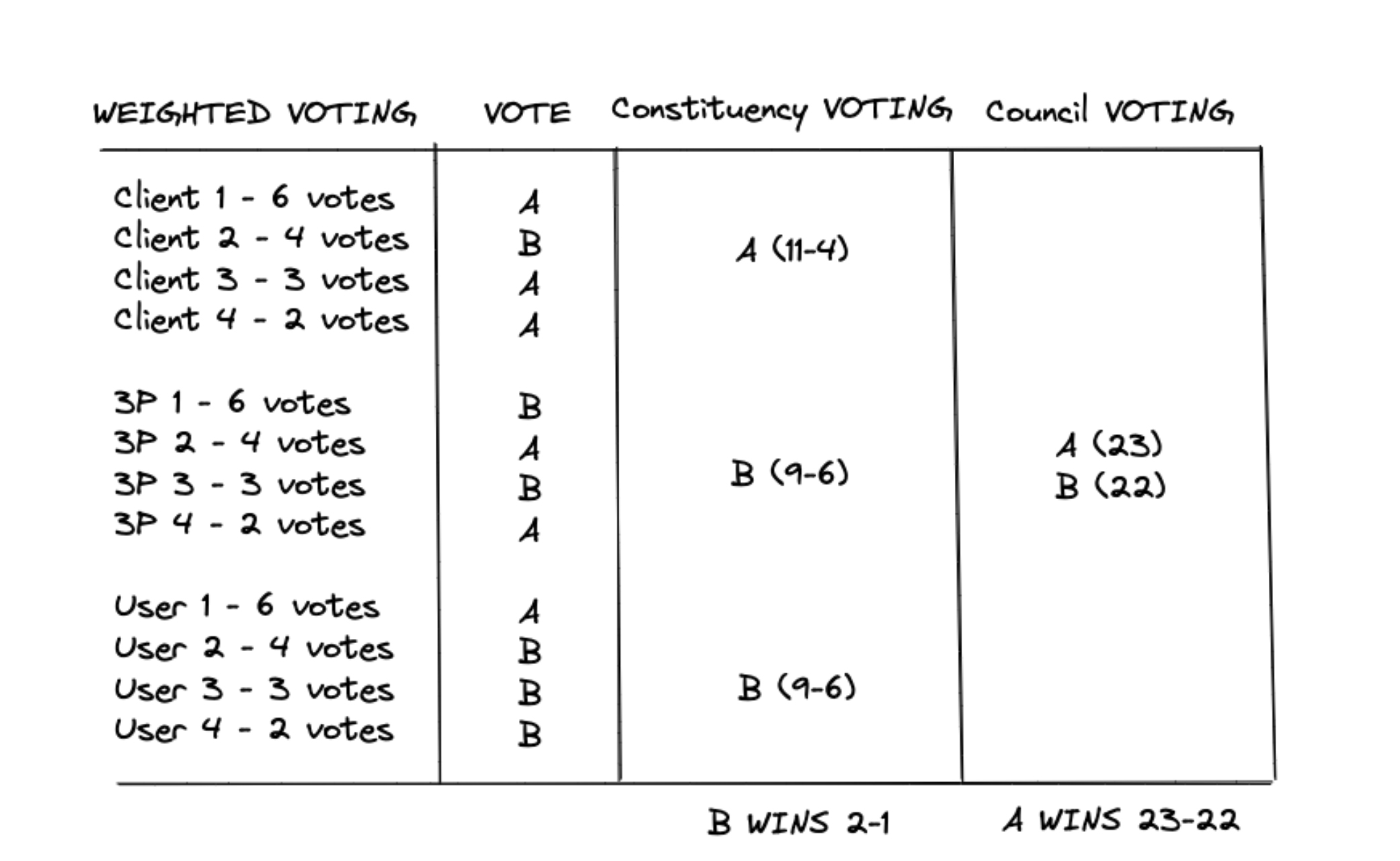This challenge can be overcome by using non-token based voting to provide stakeholders from each of the three constituencies with their own stakeholder councils. In particular, non-transferable NFTs (aka soulbound NFTs) could be awarded to certain individuals within each constituency, entitling such holders to propose and vote on matters before the DAO.