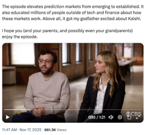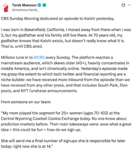 When the founding team of Kalshi recently sat down with CBS Sunday morning, they reached a different audience from the “chronically online” online of tech Twitter. Tarek Mansour, Kalshi’s CEO, shared the story of a Kalshi team member’s mom that speaks to the power of reaching different audiences through traditional media: