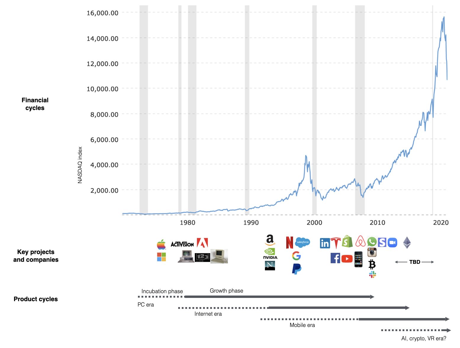 The key idea is that product and financial cycles evolve mostly independently. The top of the chart shows the Nasdaq index as a rough proxy for financial sentiment. Financial sentiment fluctuates unpredictably and sometimes wildly.