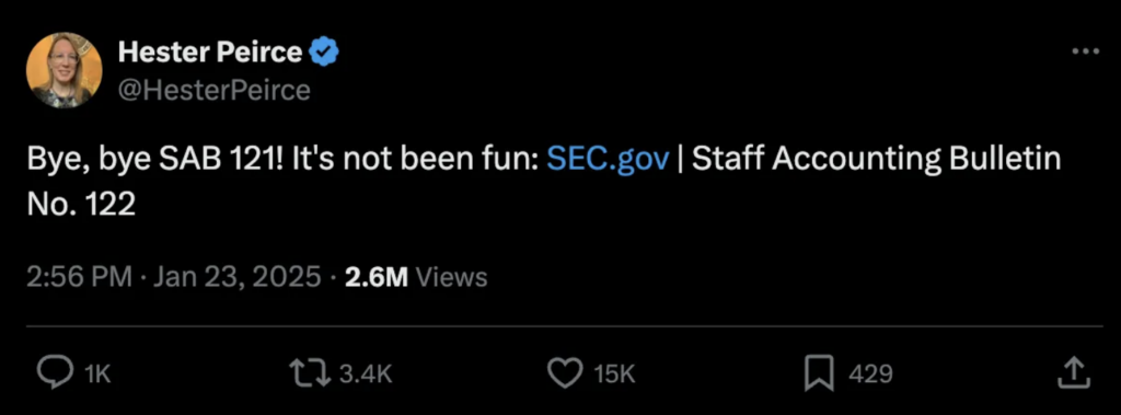 The update: Last week, the SEC issued Staff Accounting Bulletin (SAB) No. 122, which “rescinds the interpretive guidance” in the bulletin series entitled Accounting for Obligations to Safeguard Crypto-Assets an Entity Holds for its Platform Users” — aka SAB No. 121.