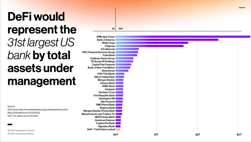 Consider the financial system. The status quo has failed many people: More than 1.7 billion people don’t have bank accounts, per the World Bank. Demand for decentralized finance or DeFi, and digital dollars, has increased dramatically in the past few years, even after accounting for the recent downturn, as the accompanying slides show. (See slides 26, 28, and 33.) For underserved and unbanked populations – 1 billion of whom have mobile phones – crypto offers a shot at financial inclusion. Projects like Goldfinch are expanding access to capital that would otherwise be unavailable in emerging markets.