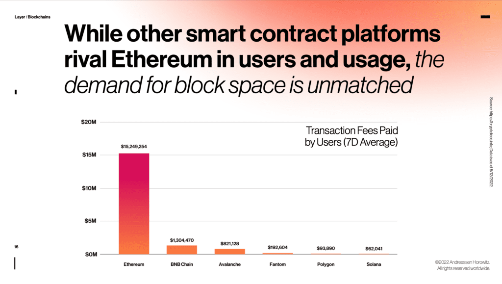 Ethereum’s lead has much to do with its early start, and, the health of its community. As far as developer interest, Ethereum has far and away the most builders, with nearly 4,000 monthly active developers. (See slide 18.) Following that is Solana (with nearly 1,000) and Bitcoin (about 500). Ethereum’s overwhelming mindshare helps explain why its users have been willing to pay more than $15 million in fees per day on average just to use the blockchain – remarkable for such a young project. (See slide 16.)