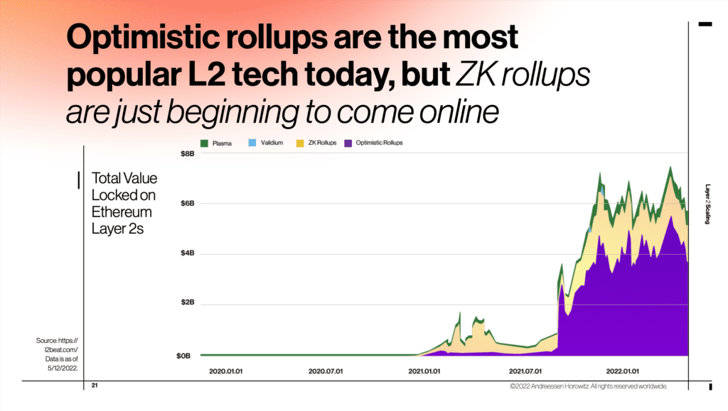 Beyond challenger blockchains, we’re also seeing incredible progress with interoperability, which allows people to “bridge” assets from one blockchain to another, as well as “layer 2” technologies, such as optimistic rollups and zero-knowledge rollups, which aim to lower costs by expanding available blockspace. (See slides 17, and 21 through 23 in the deck.)