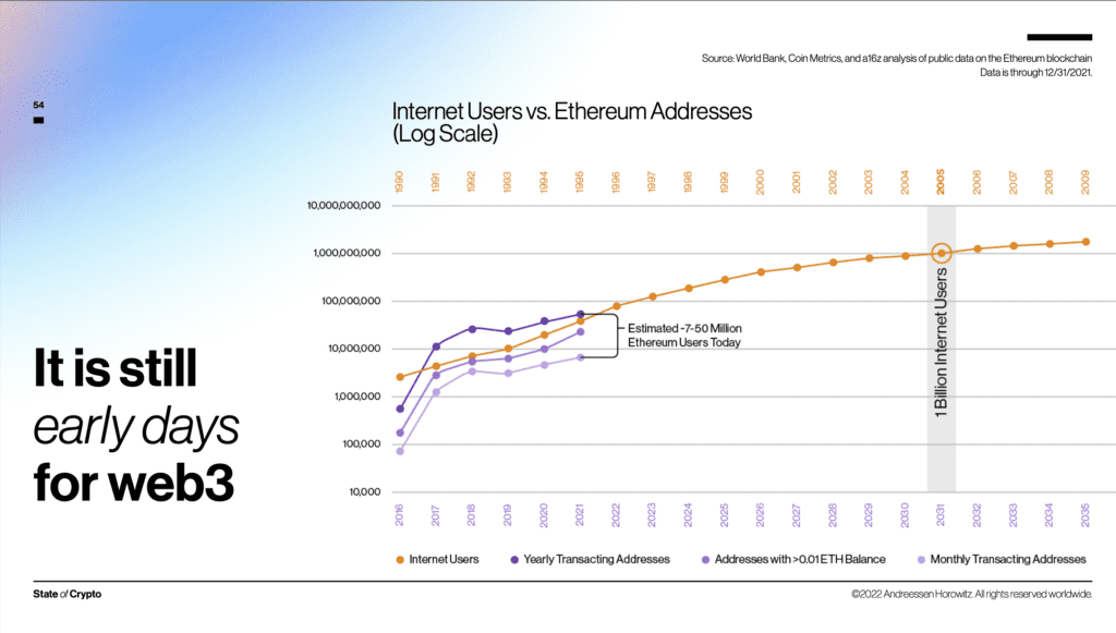While it’s hard to know the exact number of web3 users, we can reason about the scale of the movement. We estimate there are somewhere between seven million and 50 million active Ethereum users today, based on various on-chain metrics. (See slide 54.) Analogizing to the early commercial internet, that puts us somewhere circa 1995 in terms of development. The internet reached 1 billion users by 2005 – incidentally, right around the time web2 started taking shape amid the founding of future giants such as Facebook and YouTube.