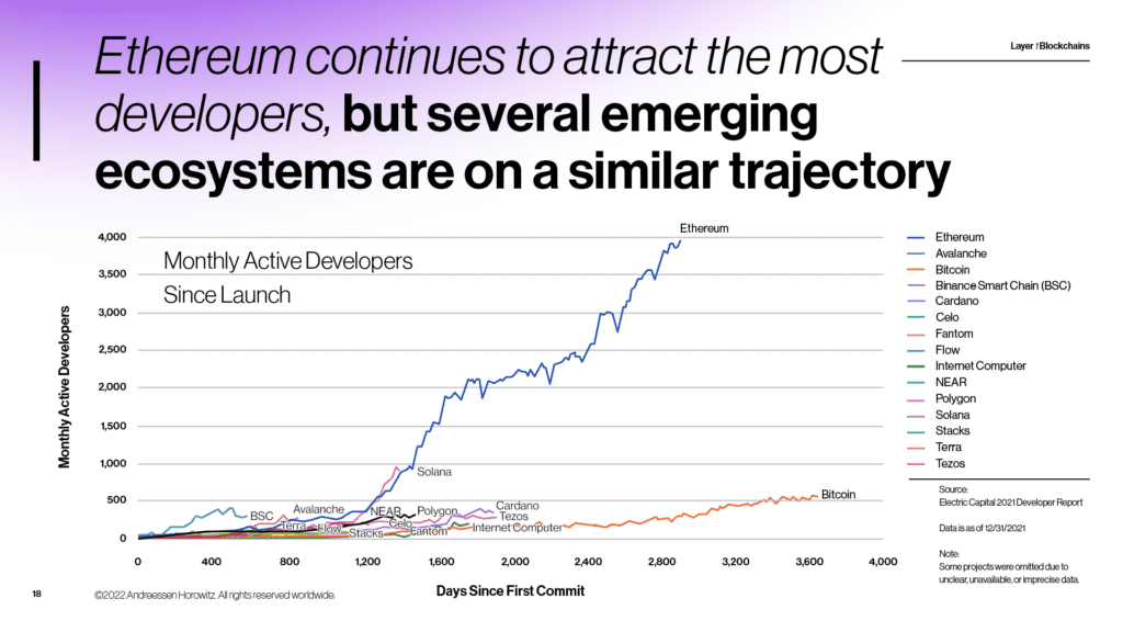 Ethereum dominates the web3 conversation, but there are plenty of other blockchains now too. Developers of blockchains like Solana, Polygon, BNB Chain, Avalanche, and Fantom are angling for similar success. (See slides 15 and 27 in the deck.)