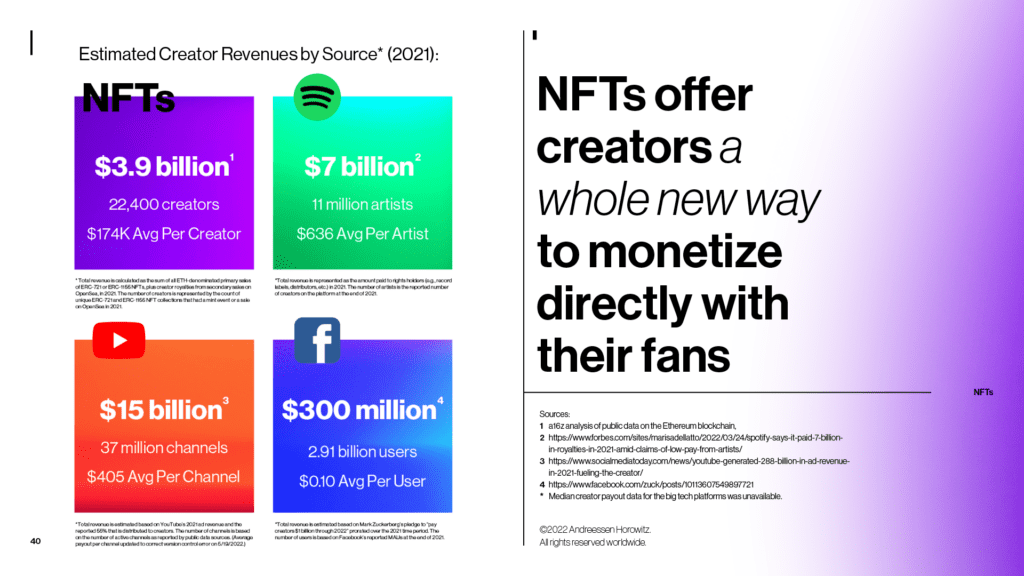 Our team conducted new data analysis to estimate how much web3 is paying out to creators compared to web2. (See slide 40 in the deck.) The numbers are telling even though it’s still early. In 2021, primary sales of Ethereum-based NFTs (ERC-721 and ERC-1155), plus the royalties paid to creators from secondary sales on OpenSea, yielded a total of $3.9 billion. That’s quadruple the $1 billion – less than 1% of revenues – that Meta has earmarked for creators through 2022.