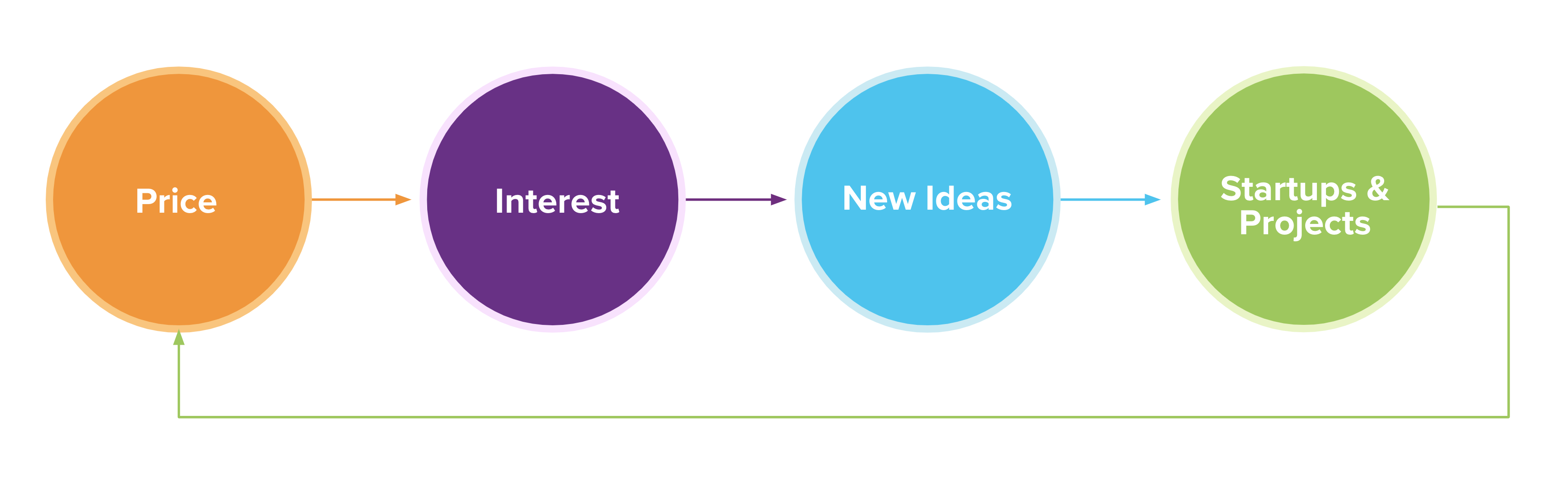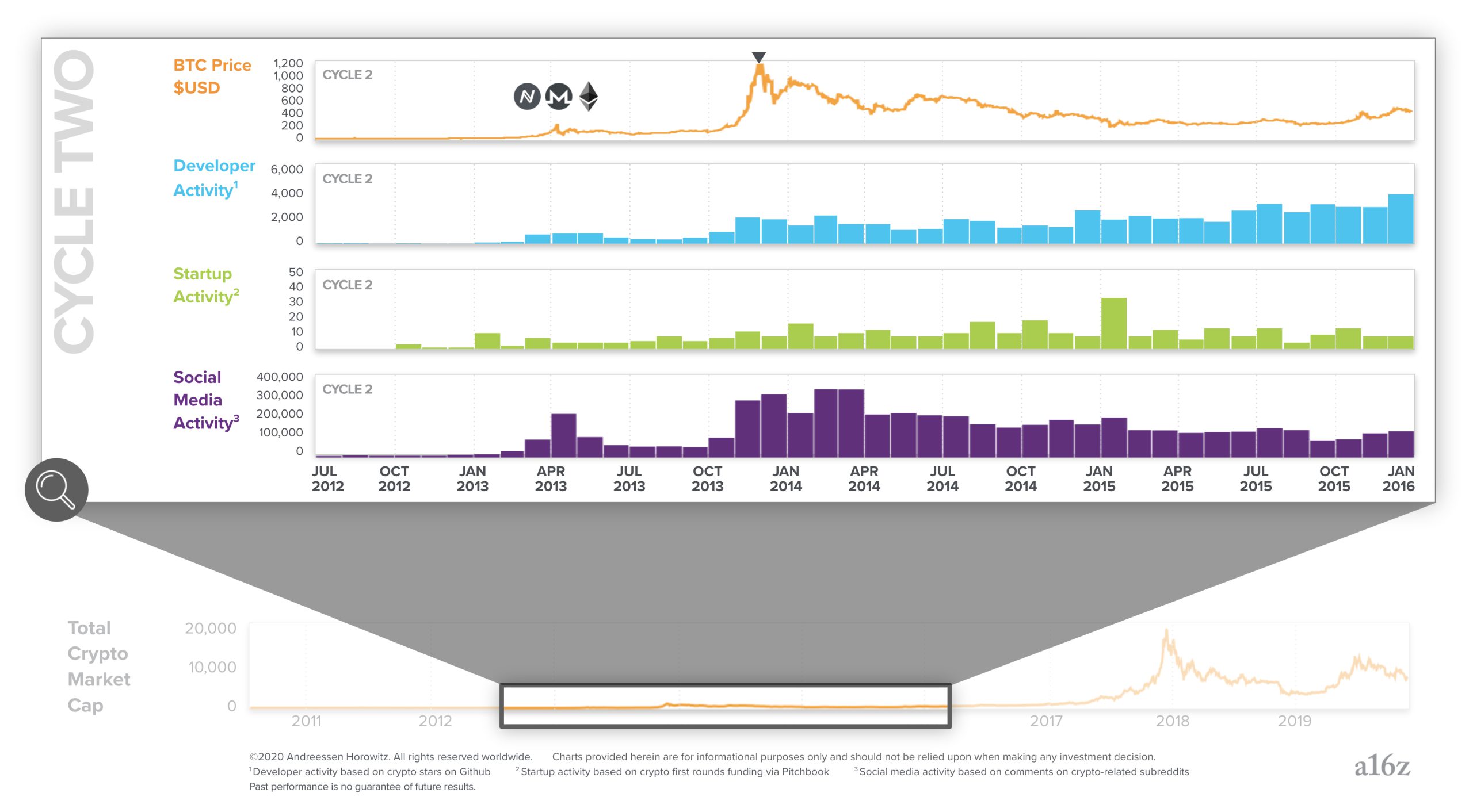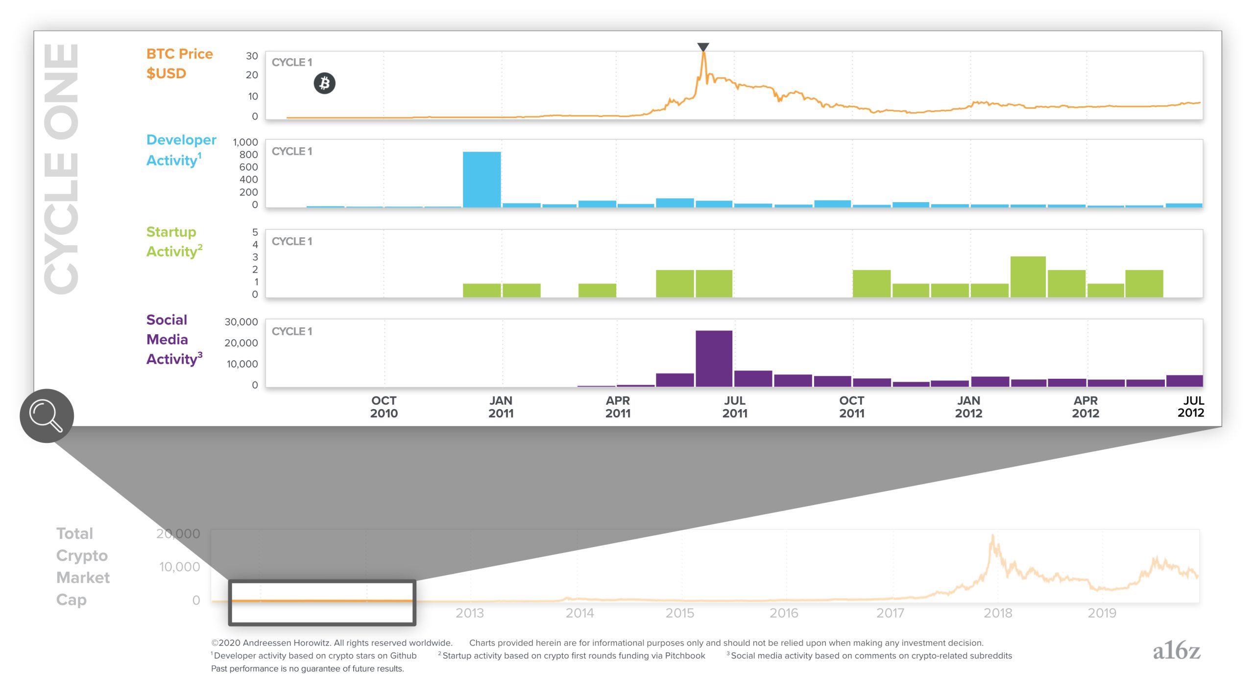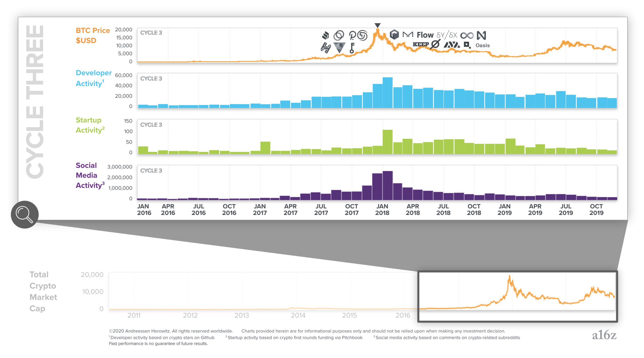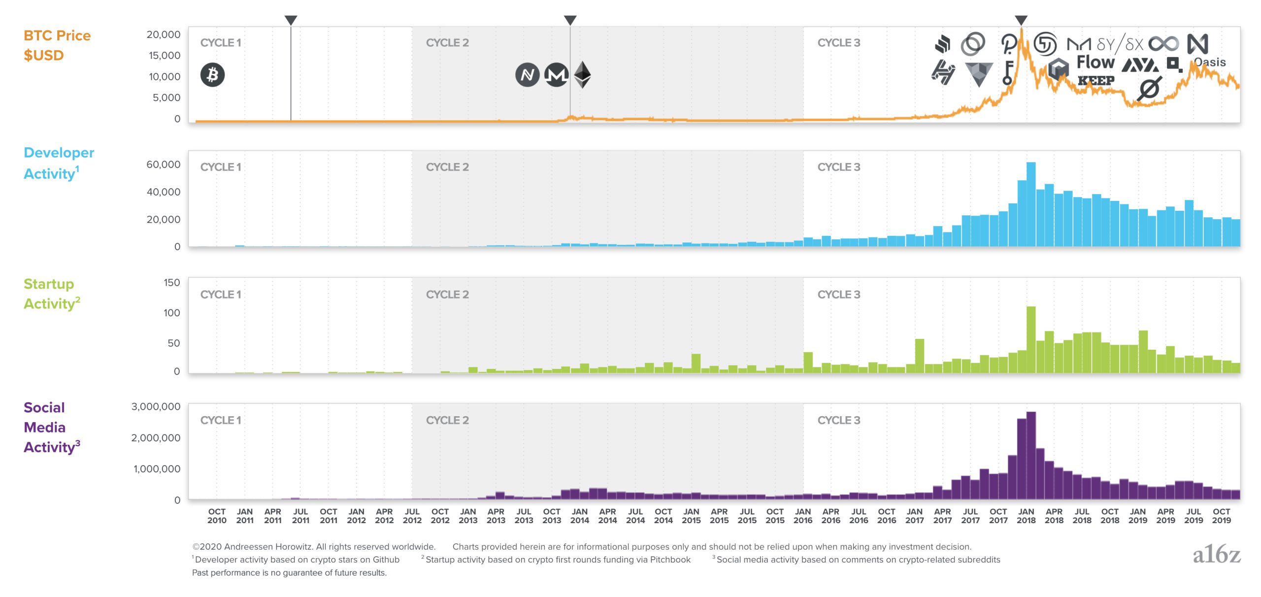 People who’ve been in crypto for a long time view the space as evolving in cycles, alternating between periods of high activity and “crypto winters.” There have been three cycles so far. The first peaked in 2011, the second in 2013, and the third in 2017.These cycles appear chaotic but have an underlying order, roughly characterized as 1) the price of Bitcoin and other crypto assets goes up, 2) leading to new interest and social media activity, 3) leading to more people getting involved, contributing new ideas and code, 4) leading to projects and startups getting created, 5) leading to product launches that inspire more people, eventually culminating in the next cycle.