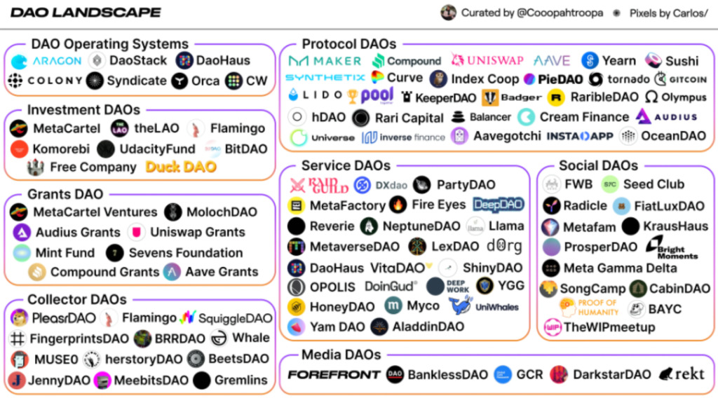 DAOs come in many different shapes and sizes: there are DAOs that govern crypto protocols (Protocol DAOs), DAOs that make venture investments (Investment DAOs), DAOs that provide services to other DAOs (Service DAOs), DAOs that purchase NFTs (Collector DAOs), and many more.
