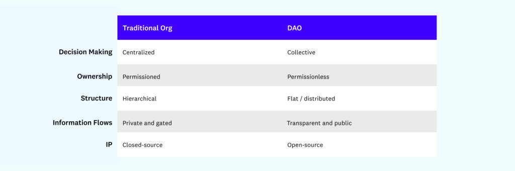 But across all DAOs, there are a few common threads that differentiate them from traditional organizations (these are generalizations, so please note they vary based on specific instances):