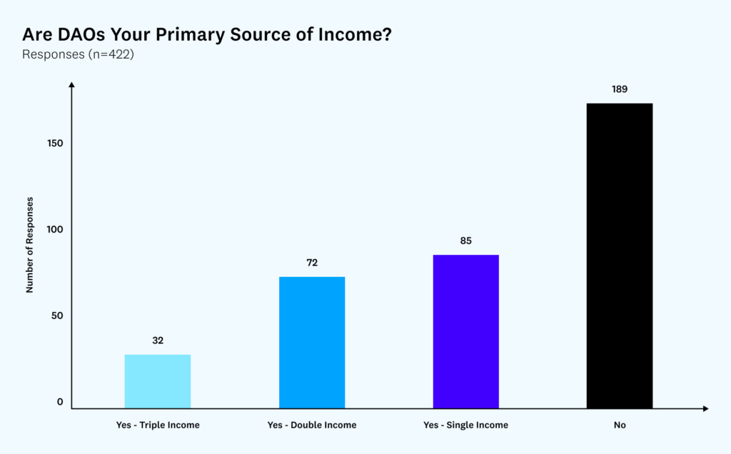 X-to-earn opportunities only become mainstream if DAOs become mainstream. DAOs show a lot of promise, but they are still early, and have a long way to develop until the future-of-work is realized. In a recent survey of 422 DAO participants conducted by Gitcoin and Bankless, <45% of respondents said that DAOs are their primary source of income.