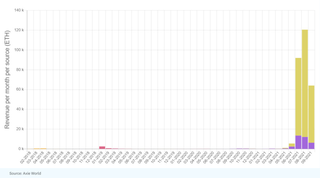 Axie is a popular blockchain game in which players buy pet NFTs (Axies), breed them, battle with them, and trade them. These actions occur in the game, but each user actually owns the Axies they purchase or create. The game has exploded in popularity over the last few months, earning over 200k ETH (currently $860 million) in combined revenue in July and August (these numbers have since declined, which is the subject of heated debate that I speak to more below).