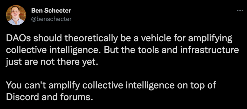 DAOs have an incredible potential to harness the power of decentralized networks and people’s collective intelligence, but they will need better software tools to coordinate. DAOs will need tools that support governance (e.g., Snapshot, Orca), software collaboration (e.g., Radicle), treasury management (e.g., Parcel, Multis, Gnosis), discussion (e.g., Discourse), access (e.g., CollabLand) and more.