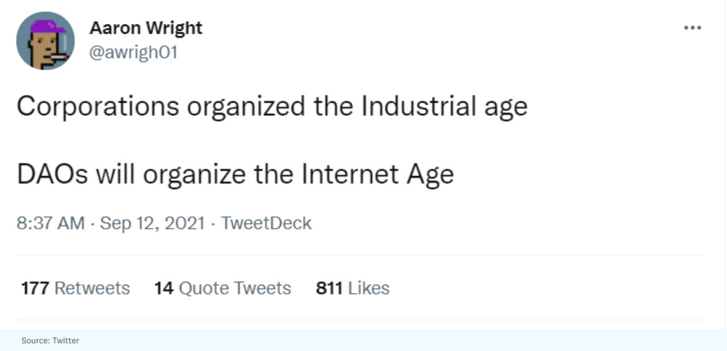 DAOs will eventually replace the traditional model. A DAO is an internet-native organization with core functions that are automated by smart contracts, and with people who do the things that automation cannot (e.g., marketing, software development). In practice, not all DAOs are decentralized or autonomous, so it is best to think of DAOs as internet-based organizations that are collectively owned and controlled by its members.