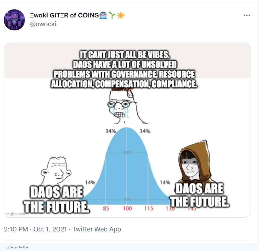 There are limits to how much the human brain can process. Dunbar’s number is the notorious limit for how many social relationships the human brain can manage, but “DAObar’s number” is the DAO version of that: how many DAOs can a person be meaningfully involved in? Each subsequent DAO involvement is an increase in the processing power needed to maintain context and awareness of everything going on. DAO tooling for communication and collaboration (discussed above) will attempt to mitigate this, but people may struggle with the extra overload.