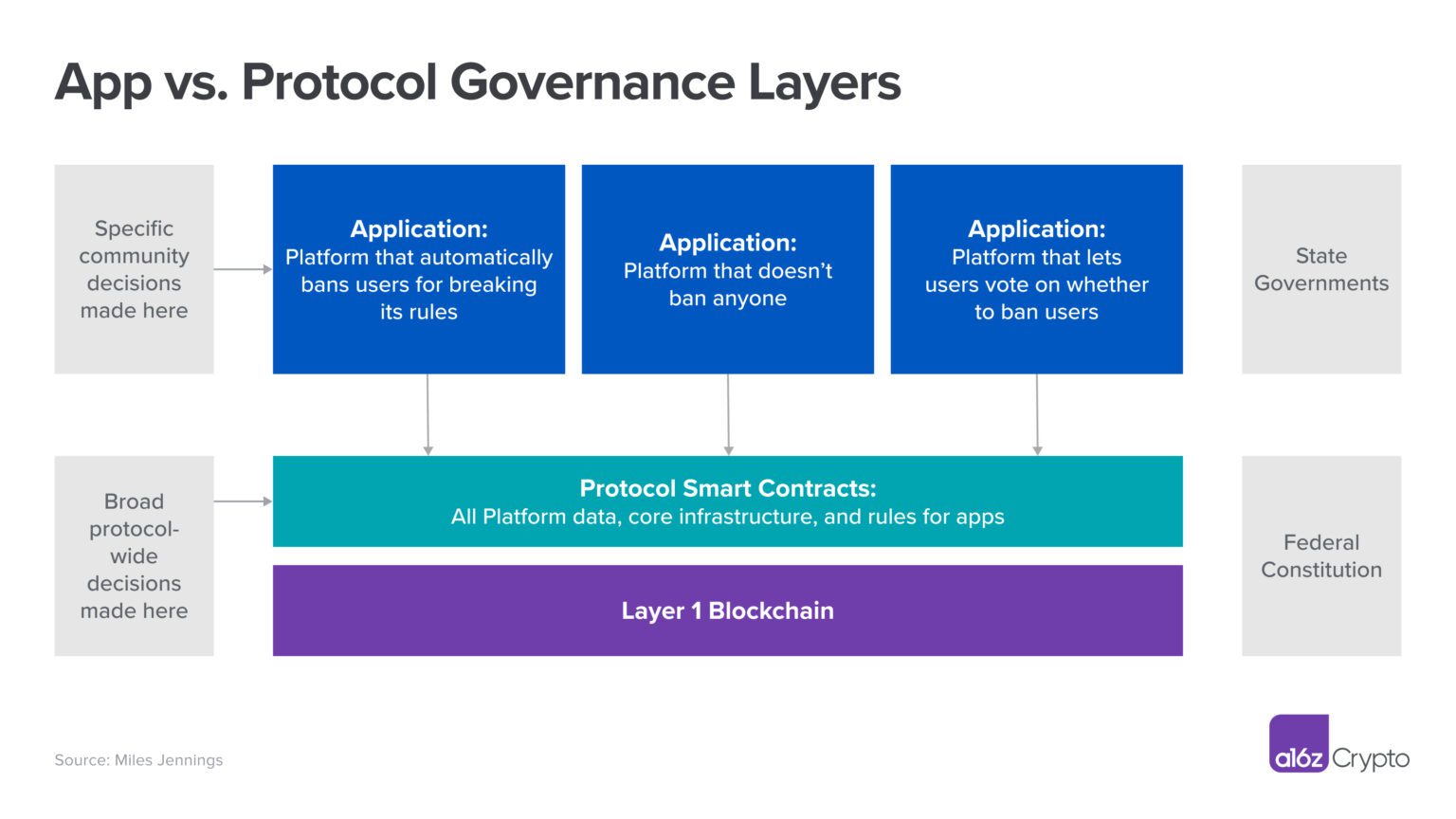 4. Changing the rules (if necessary).An array of design choices exists in determining the relationship between protocol and app layers. Protocols may be fully neutral and unchangeable, or they may incorporate an amendment process. Conversely, the apps could feature more adaptability suited for their curated communities, subject to core limitations imposed by the protocol.