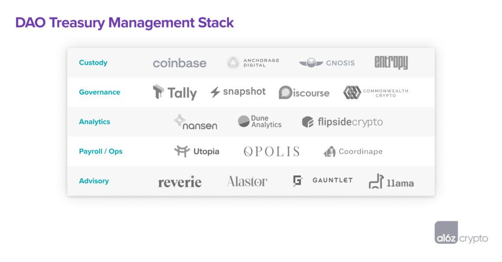For DAOs or companies holding crypto, the diagram below lays out the key operational pieces that may be required as well as some of the leading options in each:At a minimum, a secure wallet setup is necessary to ensure assets are always safely custodied. This is particularly relevant any time assets are being deployed into other protocols or otherwise moving on-chain. Options range from traditional custodians such as Anchorage or Coinbase to decentralized or multi-sig options, like Entropy or Gnosis.