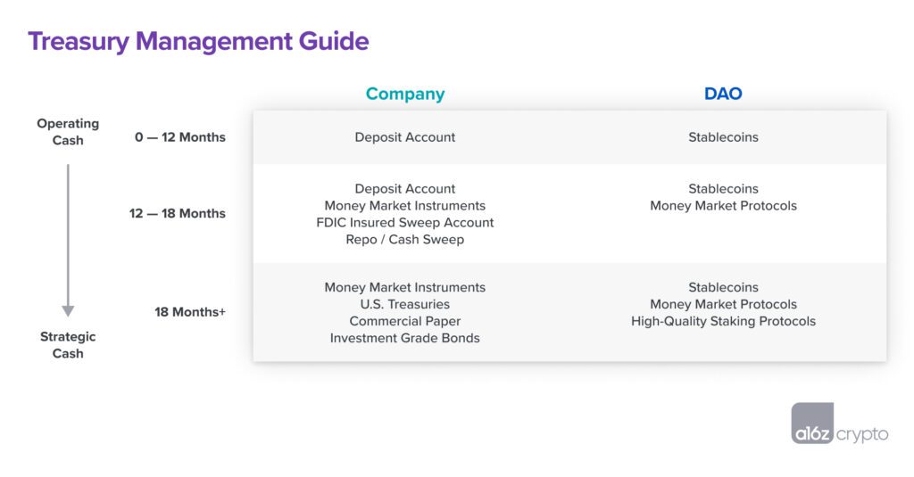 Treasury management is a core function of any organization, but it is particularly relevant today given the uncertainty of present market conditions. From decentralized autonomous organizations, or “DAOs,” to traditional startups, teams are reckoning with a market environment featuring high inflation, low yields, and a tightening of financing options across both public and private markets. In light of this new normal, teams should place greater emphasis on conservative cash management principles in order to weather storms and emerge stronger on the other side of them.