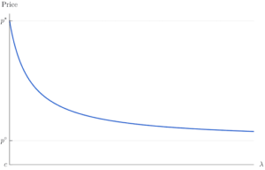 When platforms are only able to offer a single price to both types of consumers, the price curve declines in the share of the market that’s mobile, denoted by λ in the figure below. This makes sense, since the more of those consumers there are, the more firms want to compete for them.