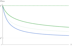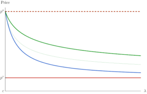 But if the platforms are monopolizing their captive customers, that means they have to drop their price a lot — and take a big loss — if they want to attract their competitors’ loyal customers… which reduces the likelihood that a platform will try to steal its competitor’s loyal customers. As a result, firms can charge even their loyal customers more; this is the solid green line in the figure below.