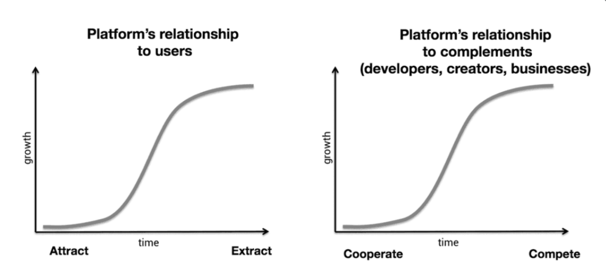 When they hit the top of the S-curve, their relationships with network participants change from positive-sum to zero-sum. To continue growing requires extracting data from users and competing with (former) partners.